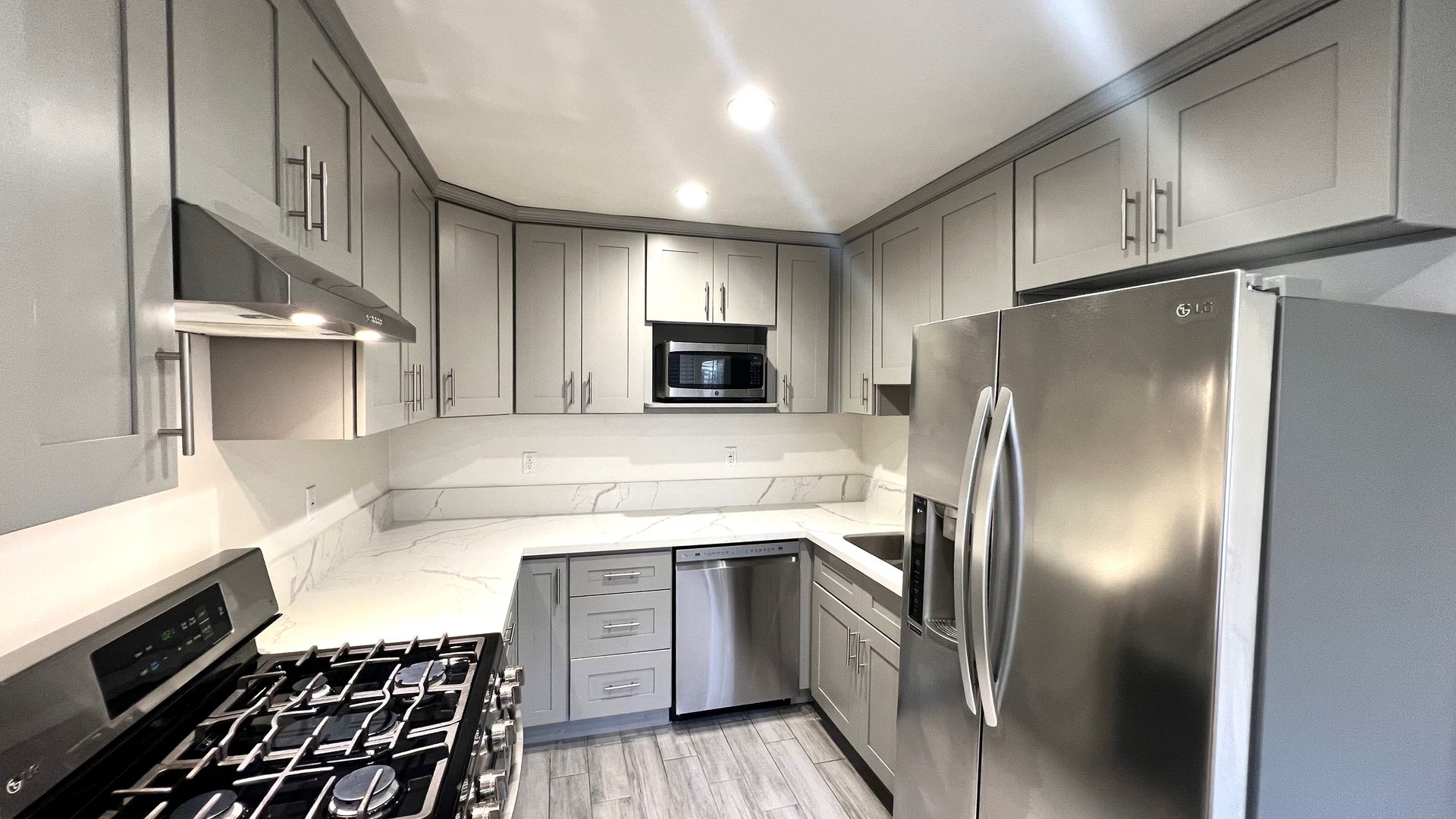 Beautiful, spacious apartment home has been completely remodeled featuring a designer kitchen with quartz counters and custom cabinetry, custom tile work, new flooring, ceiling fans and more