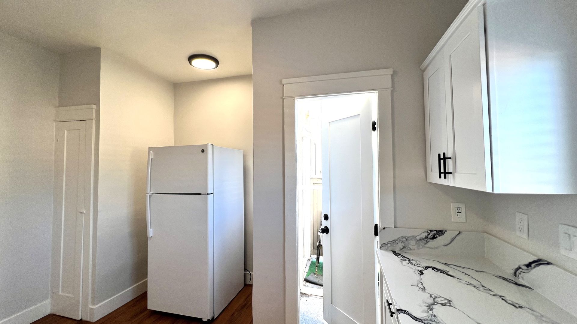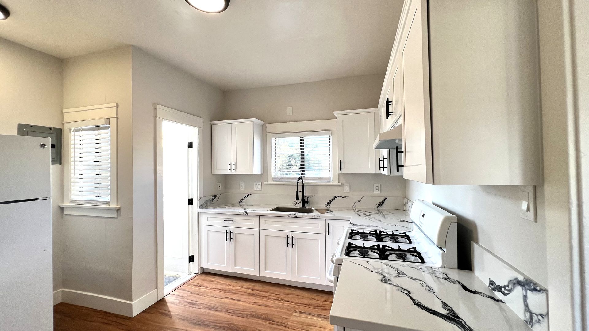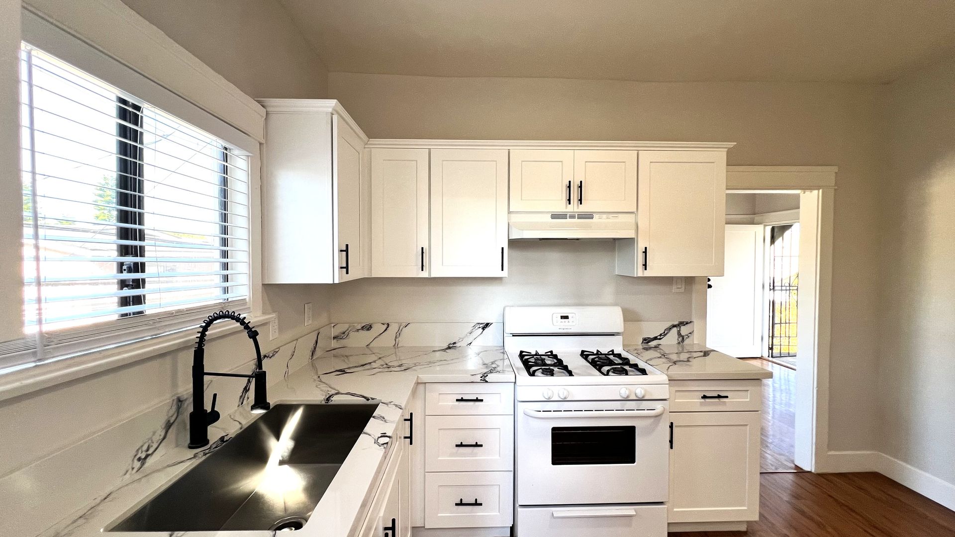 Completely updated kitchen offers plenty of counterspace, storage, and a deep sink.